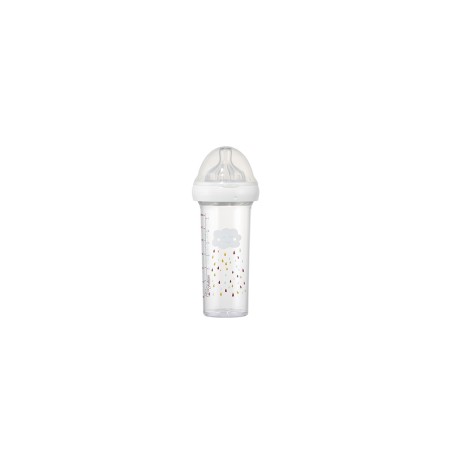 Appartient à la famille des biberons gigognes intégralement fabriqués en France, vous pouvez les combiner avec deux autres biberons de 210 ml. Toutes nos bouteilles sont en copolyetser puériculture c’est ce qui leur confère cette transparence si unique. De plus cette matière ne capte ni l'odeur ni la couleur des aliments pour qu'il reste toujours beau. Toutes nos tétines cols larges sont en 100% pure silicone. Le flacon de 360 ml est déjà fourni avec son anneau de réduction et une tétine M recommandée pour les bébés de + de 6 mois.