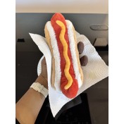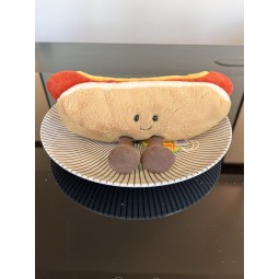 Une peluche rigolote, avec une brioche moelleuse en fourrure beige et blanche et une bonne saucisse de Francfort recouverte de moutarde, c'est sourire garanti!